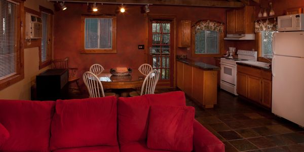 From camping-themed rooms with knotty pine interiors and vaulted open-beamed ceilings, to tastefully furnished cabins built with privacy in mind, our accommodations are designed for the needs of couples or families traveling with kids or pets. BASE RATES ARE FOR DOUBLE OCCUPANCY. ADD $15 PER PERSON OVER TWO, UP TO THE MAXIMUM OCCUPANCY FOR THE ROOM.