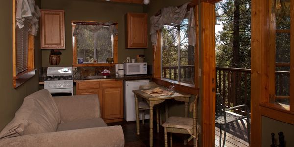 Both free-standing cabins have kitchens, private balcony with forest views, aloe vera bath amenities, free wi-fi, DirecTV. Cabins are cleaned with environmentally friendly products. For your privacy and to keep our rates affordable, we do not enter your room after check-in. CABINS ARE NOT PET-FRIENDLY. BASE RATES ARE FOR DOUBLE OCCUPANCY.
